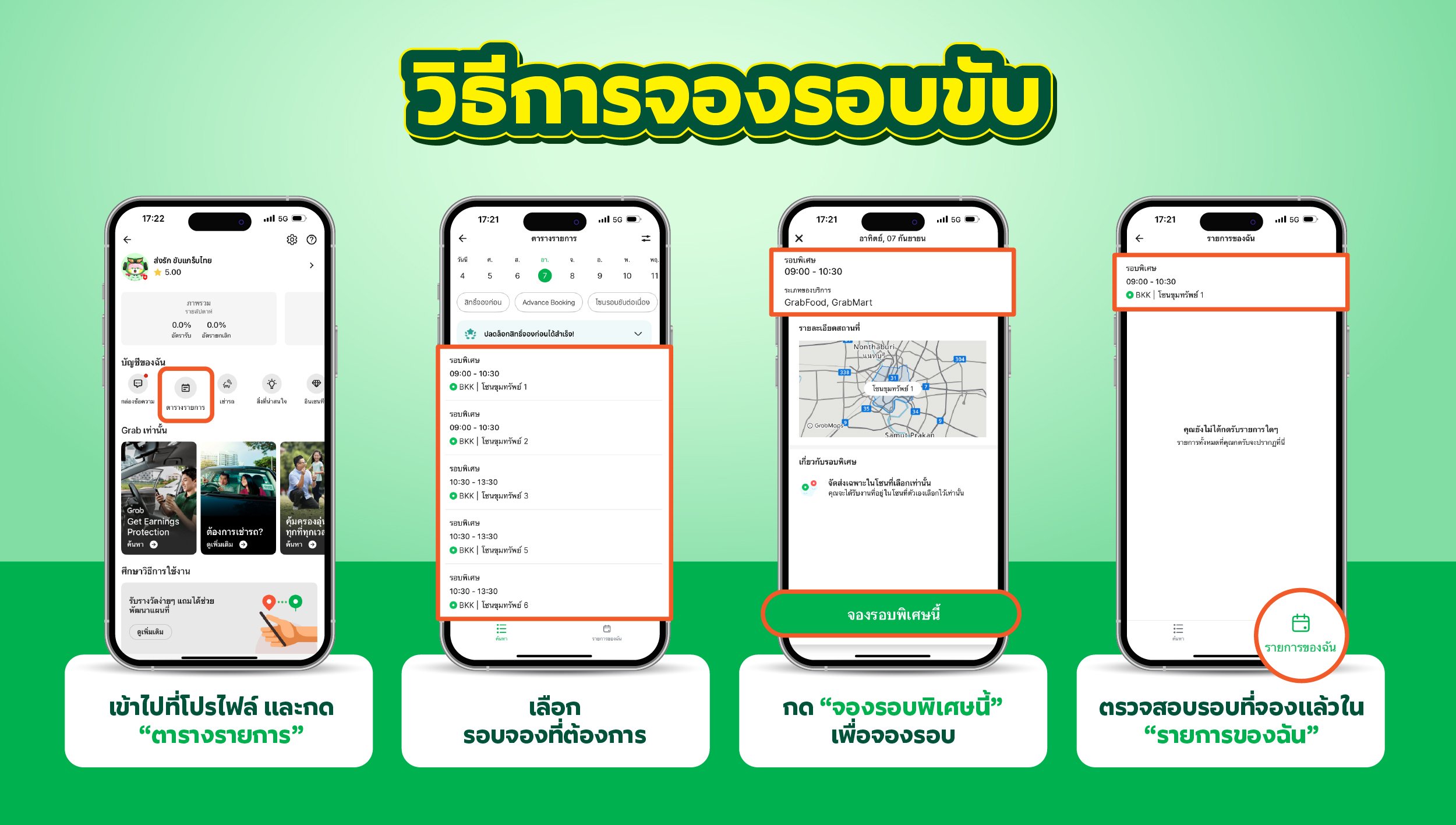 ตอบ:- สามารถเลือกรับออเดอร์ GrabFood และ GrabMart ตามเวลาและพื้นที่ที่ต้องการได้เอง