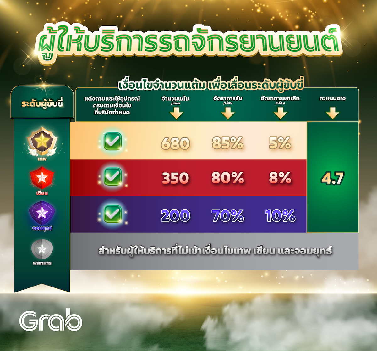 ผู้ให้บริการสามารถเลื่อนระดับผู้ขับขี่เป็นเทพ - เซียนได้ในกรณีที่มีคุณสมบัติตรงตามเกณฑ์ของระดับที่กำหนด เท่านั้น
