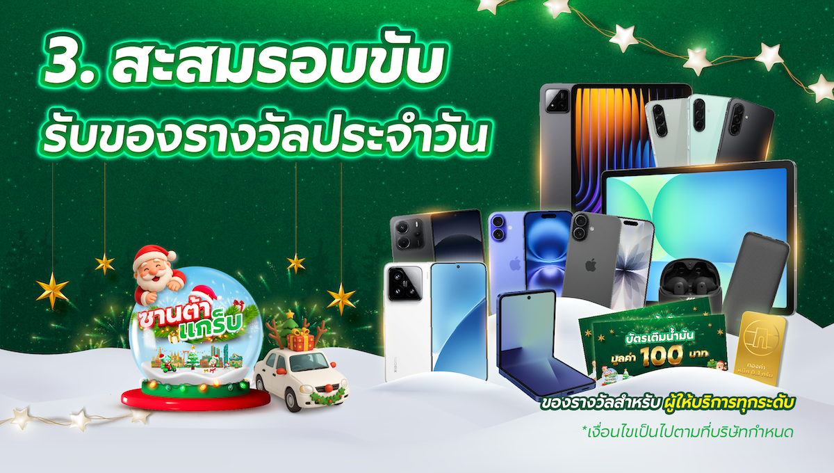 ของรางวัลจะมอบให้กับผู้ให้บริการที่อยู่ระดับเทพติดต่อกันในเดือนตุลาคม พฤศจิกายน และธันวาคม 2568 และมีรอบขับสะสมสูงสุดวันที่ 1 มกราคม 2569 ในกิจกรรม “ซานต้าแกร็บ 2025” จำนวน 1 เครื่อง