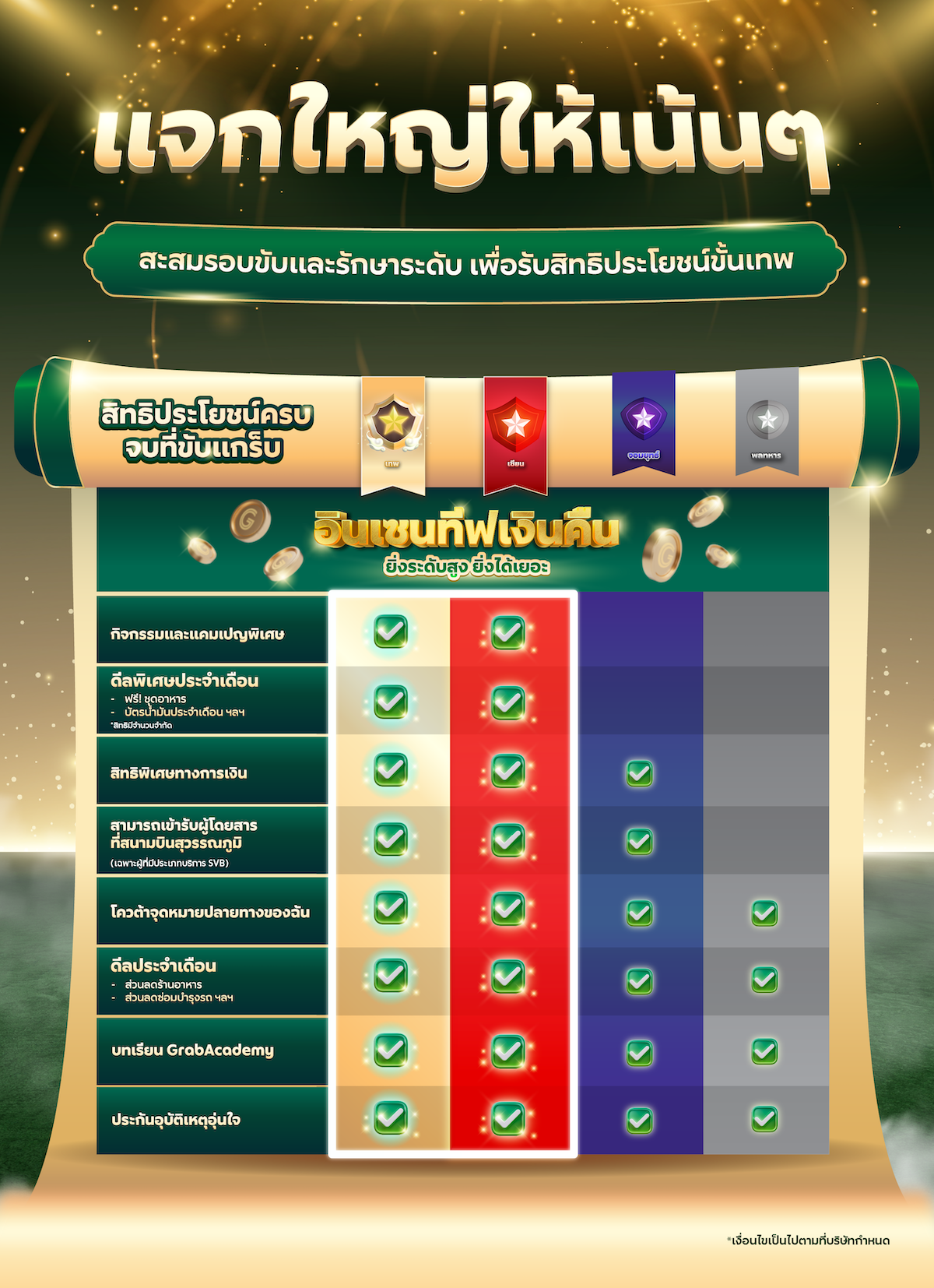 แบ่งกลุ่มตามระดับผู้ขับขี่ 3 เดือนล่าสุด โดยแกร็บจะแจ้งกลุ่มของท่านให้ทราบภายใน 4 วันทำการหลังจากระดับผู้ขับขี่ในเดือนปัจจุบันได้รับการอัพเดตแล้ว