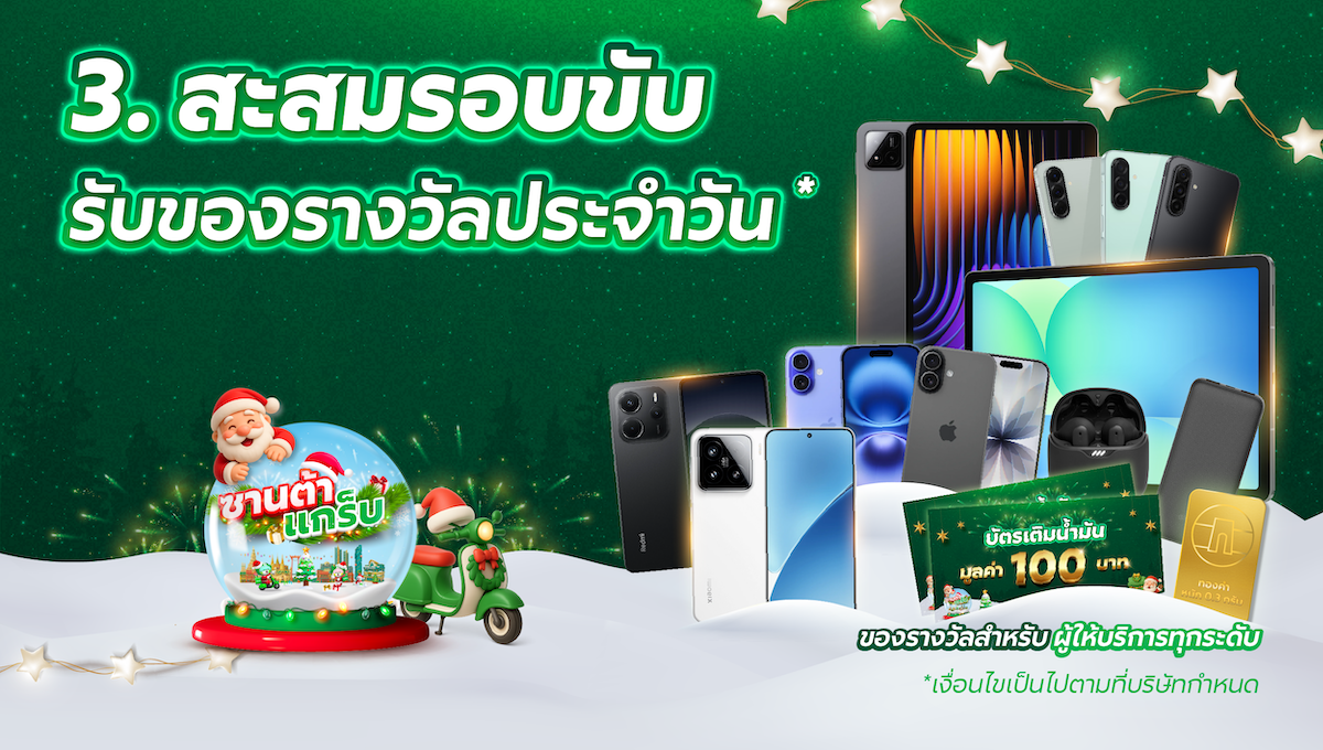 ของรางวัลจะมอบให้กับผู้ให้บริการที่อยู่ระดับเทพติดต่อกันในเดือนตุลาคม พฤศจิกายน และธันวาคม 2568 และมีรอบขับสะสมสูงสุดวันที่ 1 มกราคม 2569 ในกิจกรรม “ซานต้าแกร็บ 2025” จำนวน 1 เครื่อง